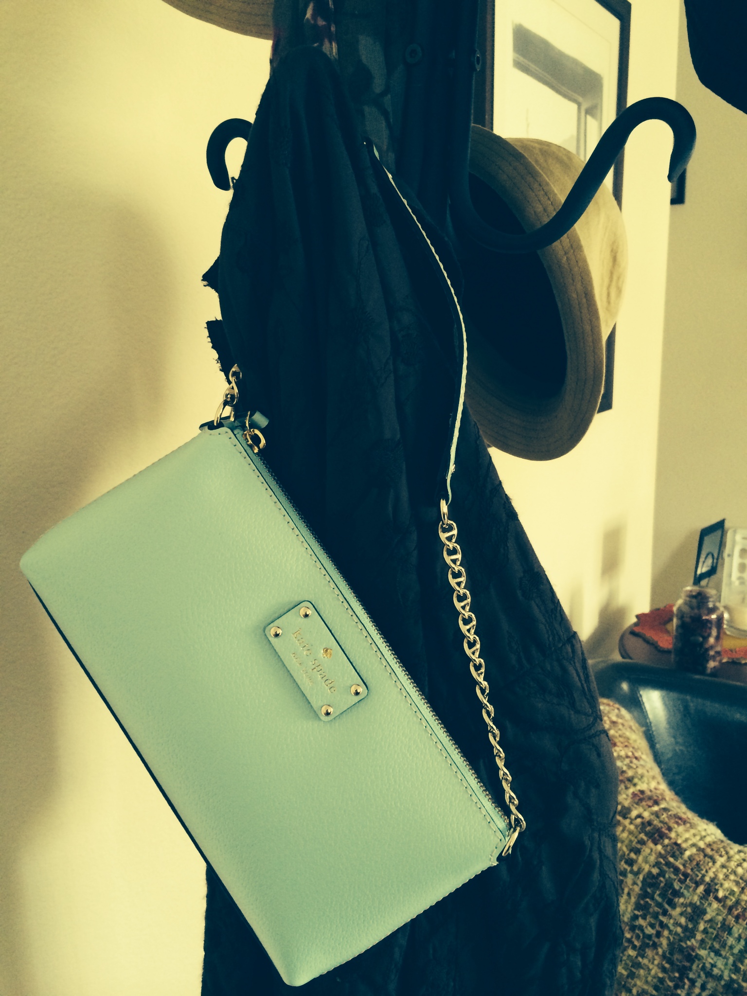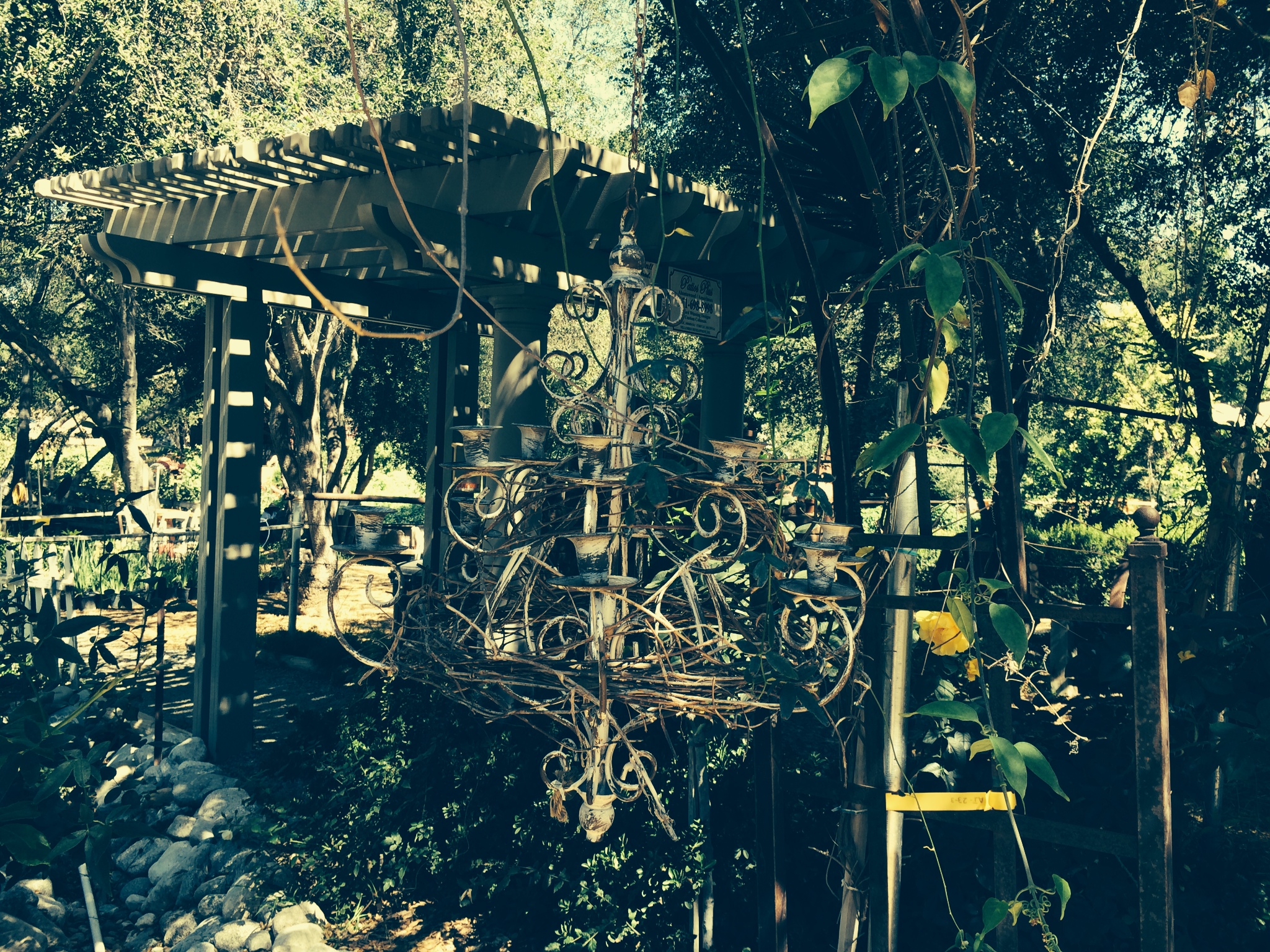 It’s difficult to see hanging in all that lovely greenery, but this is an antique chandelier for candles only.
