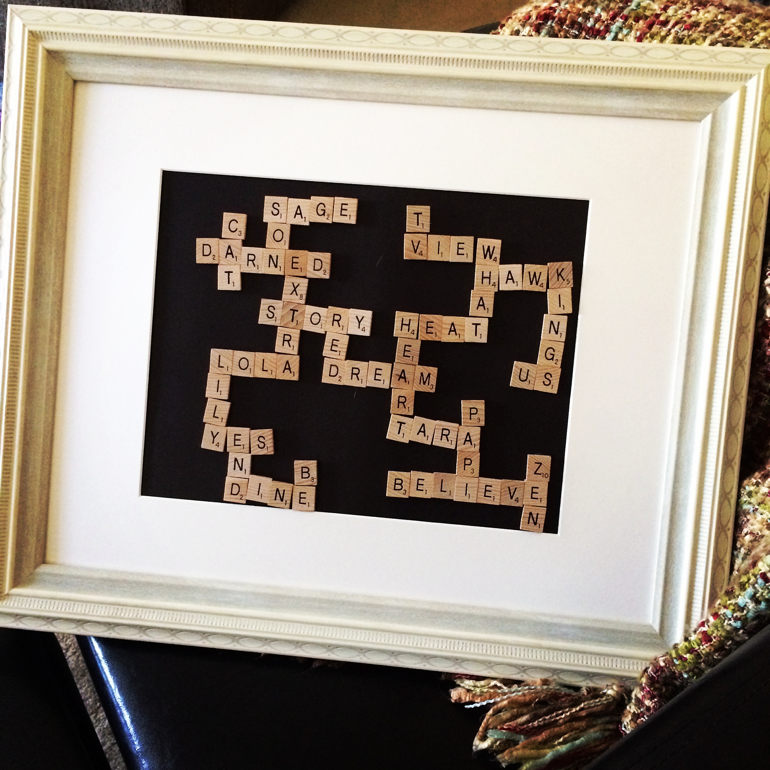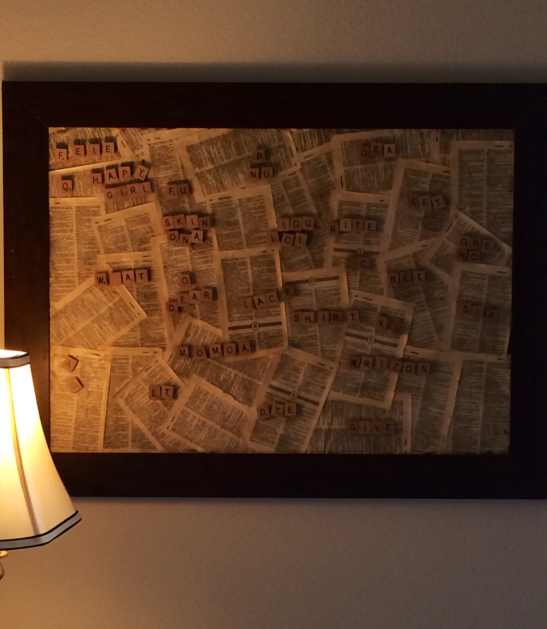 My first Scrabble frame. This one I repurposed from an old frame we had in the garage, sprayed metallic paint over the cardboard backing, and then glued the dictionary pages on. Magnets were glued to the tiles. This hangs in my bedroom. One of our cats loves to lunge at the frame to see how many tiles he can get.