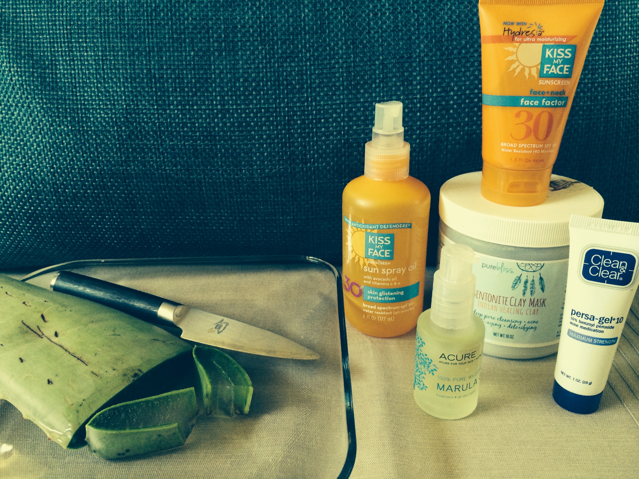 Products: Aloe Vera leaves can be found in the produce section and/or your local farmer’s market. Sun Spray Oil 30 and Face Factor 30 at kissmyface.com, Marula Oil and Bentonite Clay at Amazon.