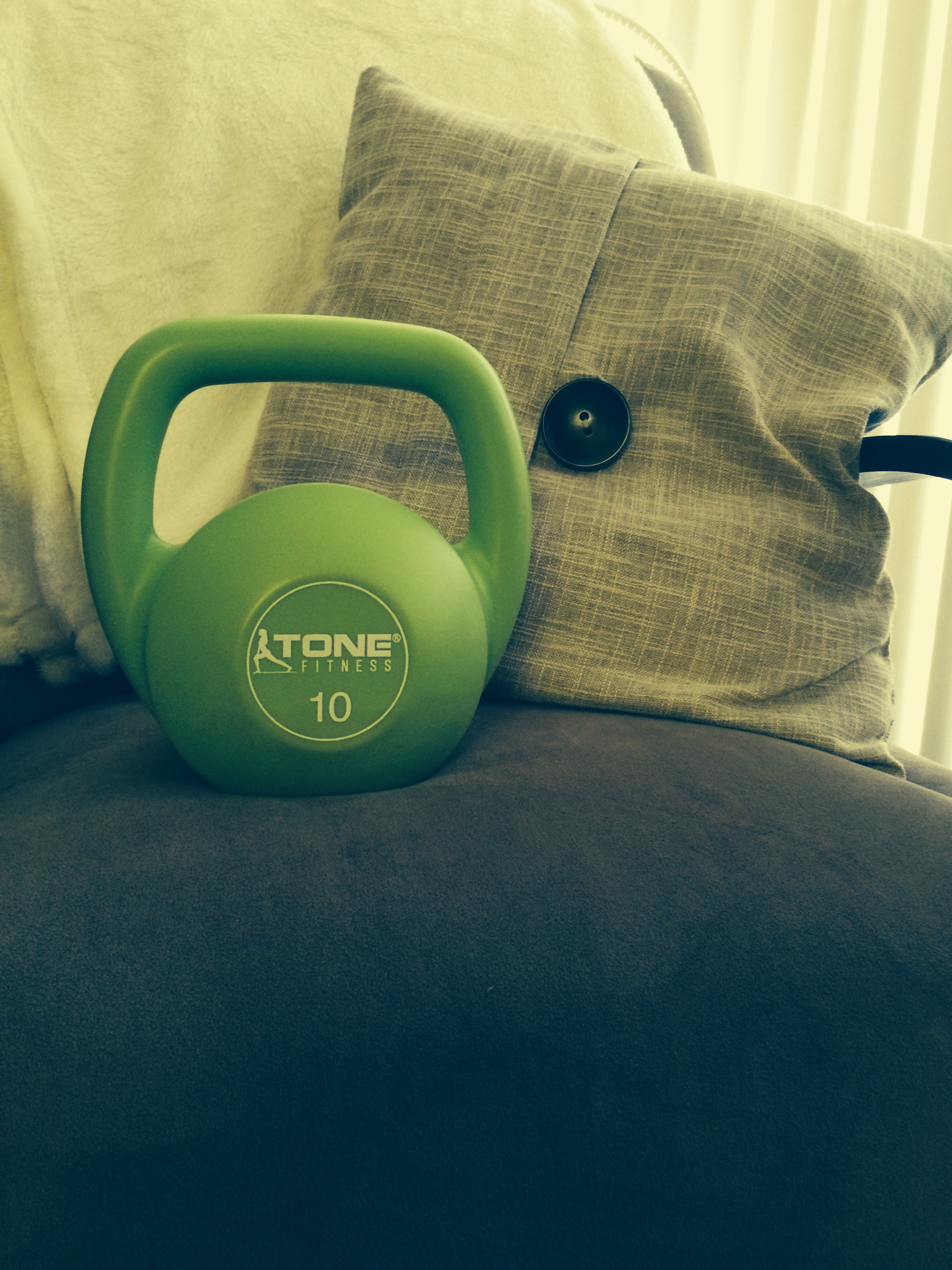 Pick up a kettle bell and throw it around! Watching TV is ok. But make it better by destroying the quilt with a short power workout. A 10-pound KB is simple to use. Try these moves: